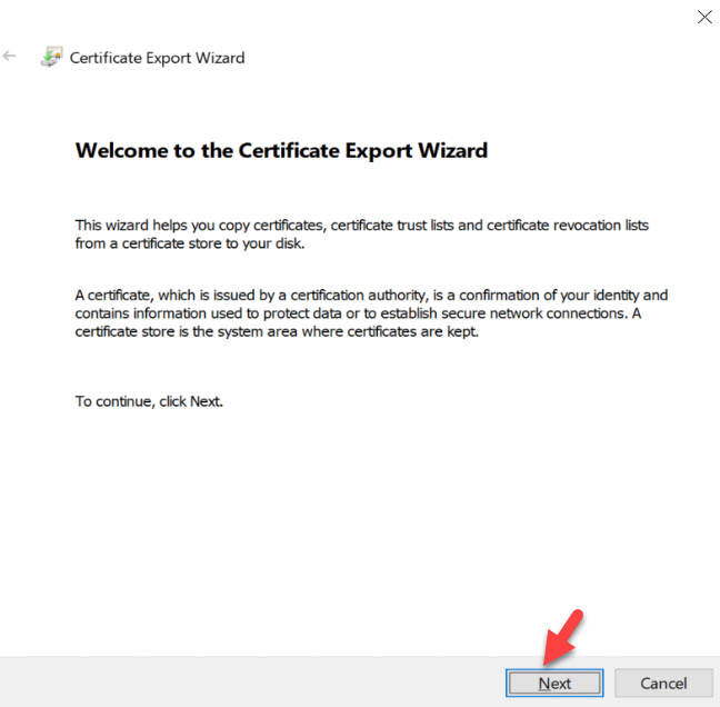 2. It will open up the certificate export wizard, click on Next to start the process.