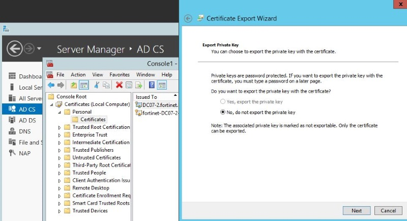 On the Certificate Export Wizard welcome screen, click Next. On the Export Private Key screen, select No, then click Next.