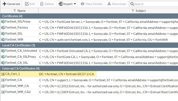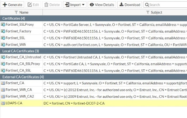 FGT # config vpn certificate ca FGT (ca) # rename CA_Cert_1 to LDAPS-CA FGT (ca) # end